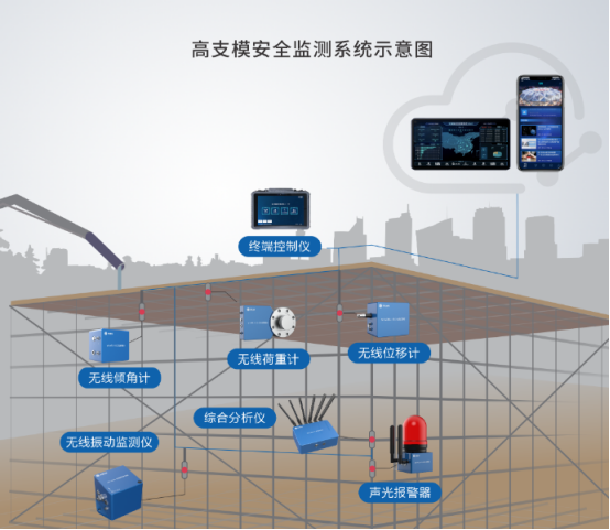 高支模安全监测系统是应用于高大模板支撑系统在浇筑施工过程中,诸多重大安全风险点进行实时自动化安全监测的解决方案。主要监测内容包括模板沉降、整体位移、顶杆失稳、扣件失效,支撑体系倾斜,承压过大等。系统采用无线自动组网、高频连续采样,实时数据分析及现场声光报警。有效降低施工安全风险,其各项性能指标均达到或超过现有高支模人工监测方法。
